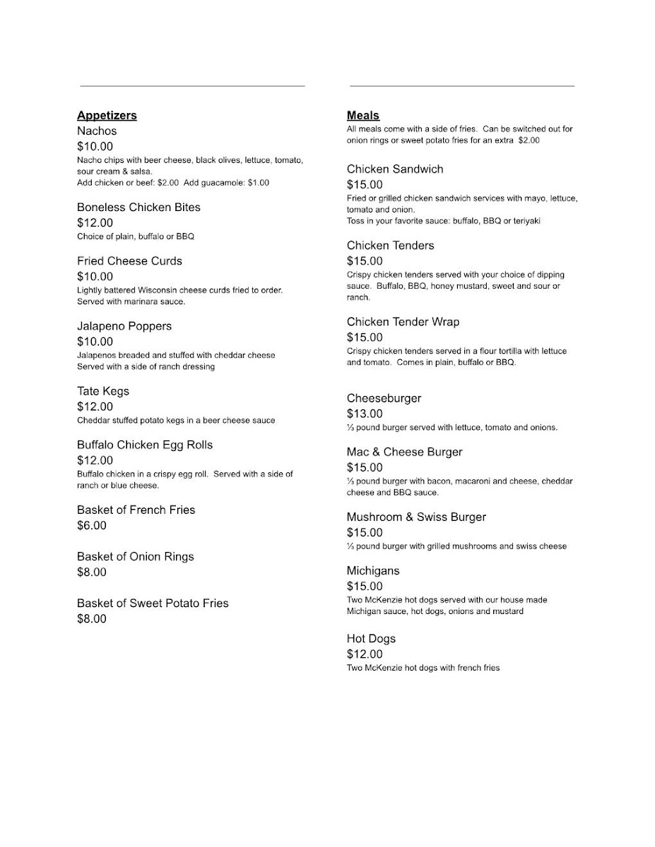 Two McKenzie hot dogs served with our house made Michigan sauce, hot dogs, onions and mustar
